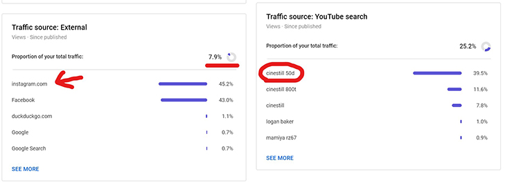The top search term — “cinestill 50d” — is the clear draw to the video. Remember Willem Verbeek’s clip up top? It’s all about the Cinestill 50D, and term is in his video’s title. Here we see the beauty of keeping topics relevant. When the big names make something related to your content, you get lumped into their ecosystem.