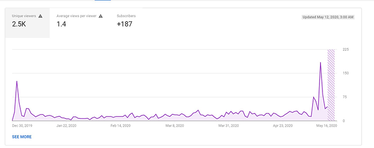I guess there are a few ways I can look at this. Either my channels’s traffic is up right now due to the uptick in YouTube usage by people stuck at home, or there’s a surge in popularity of the keywords I used, or the channel is just slowly growing due to YouTube’s algorithm recognizing an increase in engagement as time passes. Realistically, it’s probably a combination of all three of these things.