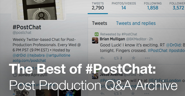 The weekly #postchat event hosted by Gordon Burkell (@AOTGNetwork), Tej Babra (@tejbabra) and Jesse Averna (@Dr0id), is a brilliant opportunity to ask post production professionals from around the world, any question you like on that week’s topic (there’s a new topic each week). PostChat is a twitter based chat for post-production professionals that occurs every Wednesday at 6 PM PST (9PM EST).