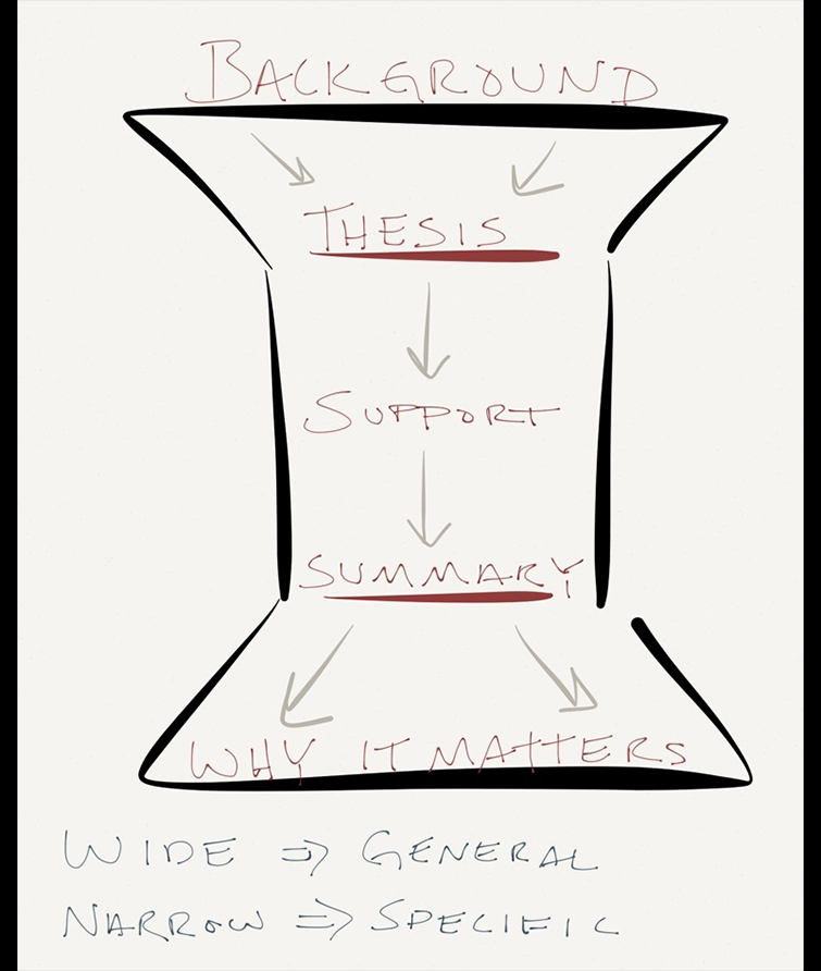 So: start with a broad background, get more specific until you reach your thesis (main idea), stay specific and support your thesis, sum it all up, then get more general and explain why it matters to your audience in the big picture.
