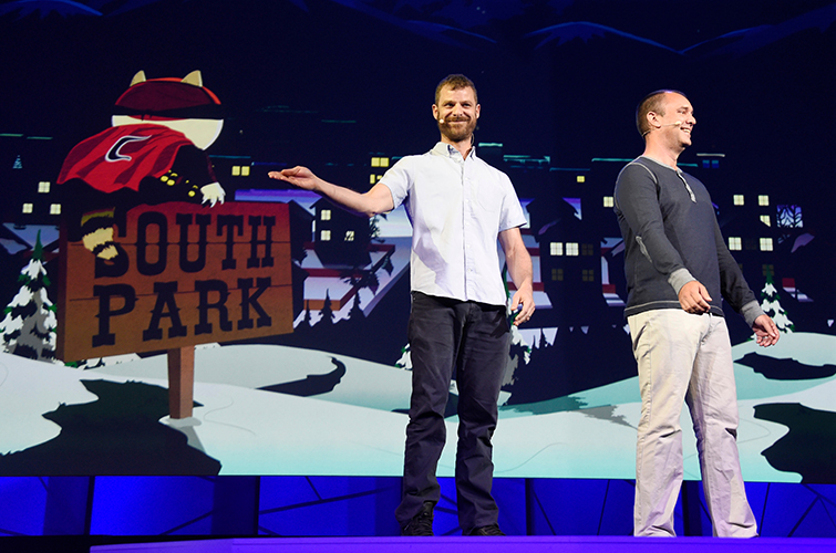 Photo by Chris Pizzello/Invision/AP/Shutterstock. South Park creators Matt Stone, left, and Trey Parker discuss the South Park: The Fractured But Whole video game onstage at Ubisoft’s E3 2015 Conference at the Orpheum Theatre, in Los Angeles. 15 Jun 2015.