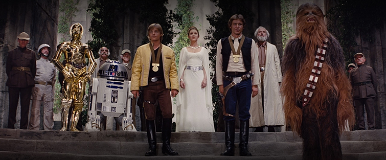 The rebel alliance has acquired the plans to a giant planet-destroying base called the Death Star; therefore the Empire boards their ship to capture Princess Leia. But, Leia hides the Death Star plans inside of a droid; therefore the plans are safe. But, Jawas capture the droids and sell them to farmers. Therefore, Luke Skywalker discovers the message and meets Ben Kenobi, who reveals himself to be Obi-wan, who knows Leia. Therefore, Luke and Obi-wan begin their journey to Alderaan. But they don’t have a ship; therefore, Han Solo, but Death Star capture and planet destruction; therefore Leia rescue mission, but lightsaber attack; therefore escape plan, but Death Star bad; therefore Rebel Alliance suicide mission, but Vader ship battle; therefore Death Star go boom. Therefore, medals. Curtains.