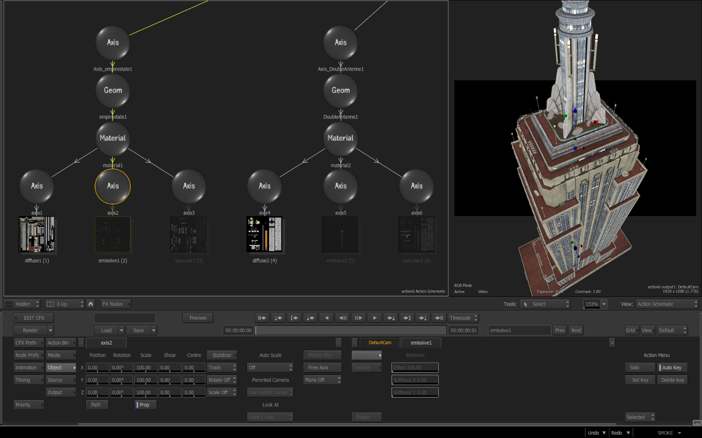 I was showing people how you can use the models from Element 3D and import them into Smoke with embedded textures. The Video Copilot Metropolitan Design Pack imports great into Smoke with full textures that realistically react to day/night lighting.