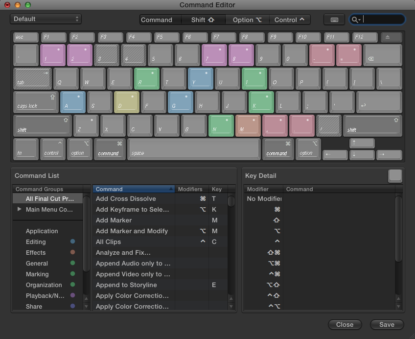- Open the Keyboard by choosing the Final Cut Pro menu > Commands > Customize. The default FCP keyboard opens.