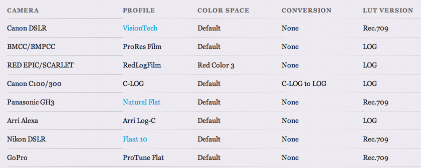 These LUTs are available in REC 709 and LOG versions. The suggested workflow is to apply the LUTs in post production between your primary and secondary corrections (primary corrections > LUT > secondary corrections). If you are not sure about using REC 709 or LOG, here’s a handy chart to help you out (click image for larger view):