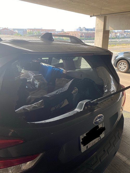 I slept very well. I woke on time. I checked out. And when I returned to the parking garage, I discovered that someone had shattered the back window of my car and stolen almost everything.