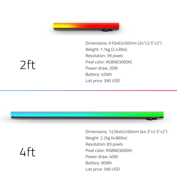 The Voyagers come in 2 ft and 4 ft options. The 2 ft option draws 20 W of power, and the 4 foot draws 40 W.