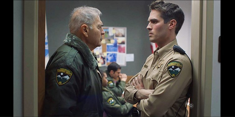 Robert Forster and Jim Cummings in a scene from The Wolf of Snow Hollow. Image via Orion.